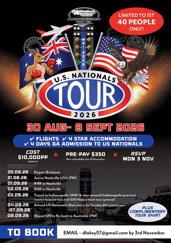 Don’t miss your chance to be part of drag racing history! Limited to 40 people only – register your interest today to secure your spot on this once-in-a-lifetime motorsport tour!